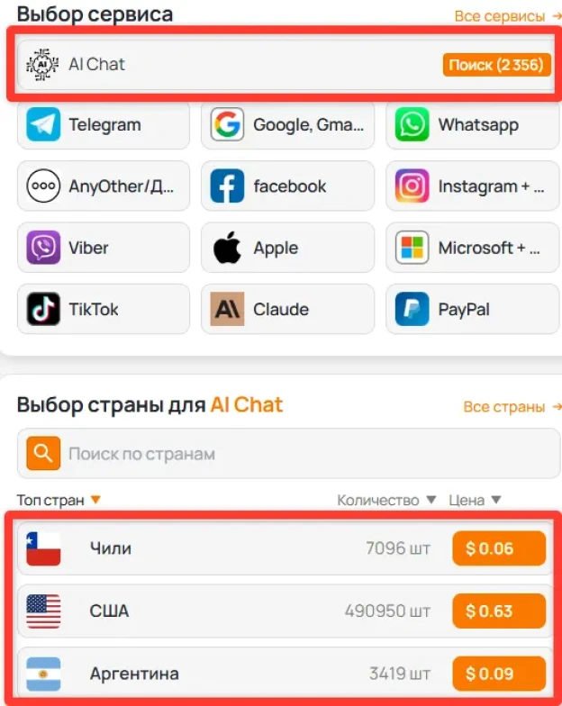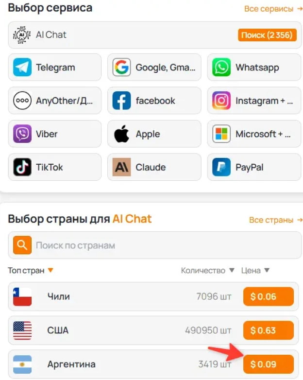 Выберите сервис в списке доступных платформ и проверьте, для каких стран доступен приём SMS. Затем выберите подходящий вариант — рядом будет указана стоимость активации.